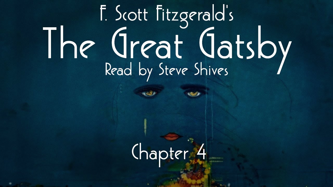 The text promotes content related to Chapter 4 of “The Great Gatsby,” including links to join a channel, support via Patreon, PayPal, and Venmo, and social media platforms. Additionally, it features podcasts, “Late Seating” and “The Ensign’s Log.” Hashtags include #thegreatgatsby and #booktube.