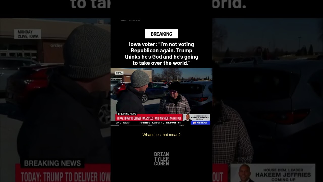 A YouTube Shorts clip titled “Iowa voter: I’m not voting Republican again” features an Iowa resident expressing disillusionment with the Republican Party and pledging not to vote Republican in the future. The video is presented as short-form opinion content, linked by the provided YouTube URL.