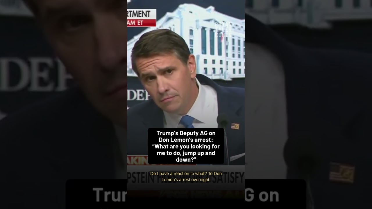 A YouTube Shorts clip features Trump’s deputy attorney general reacting to Don Lemon’s arrest, quipping, “What are you looking for me to do, jump up and down?” The video is labeled as a Shorts clip.