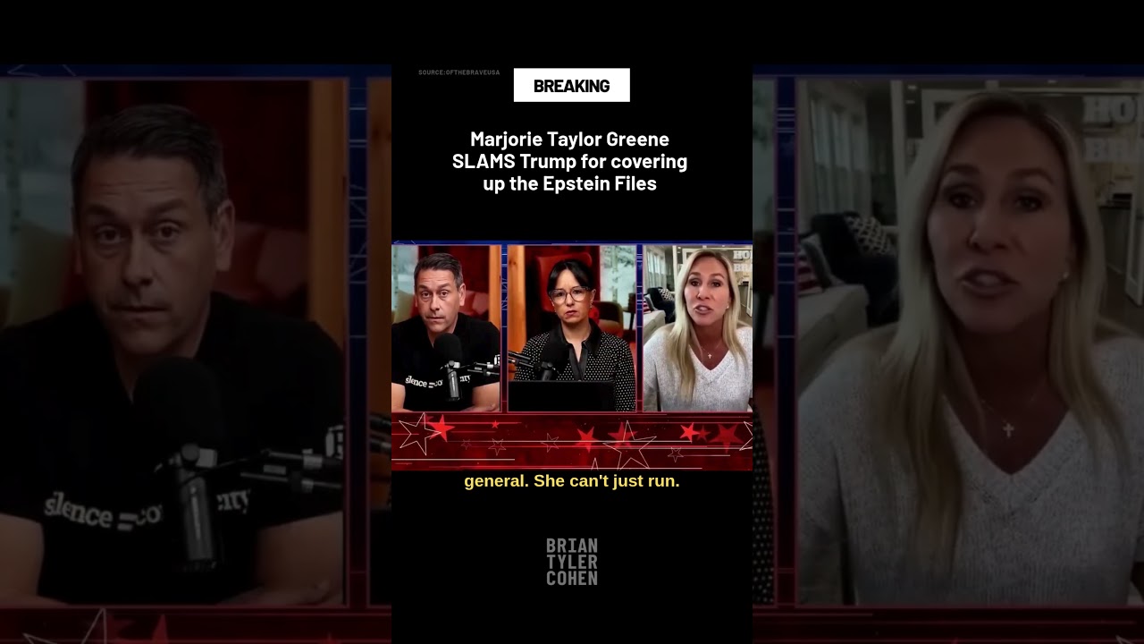 Video clip titled ‘Marjorie Taylor Greene SLAMS Trump for covering up the Epstein Files’ shows MTG accusing Trump of concealing Epstein-related documents. Labeled as #shorts, the YouTube post frames a political clash over Epstein investigations.