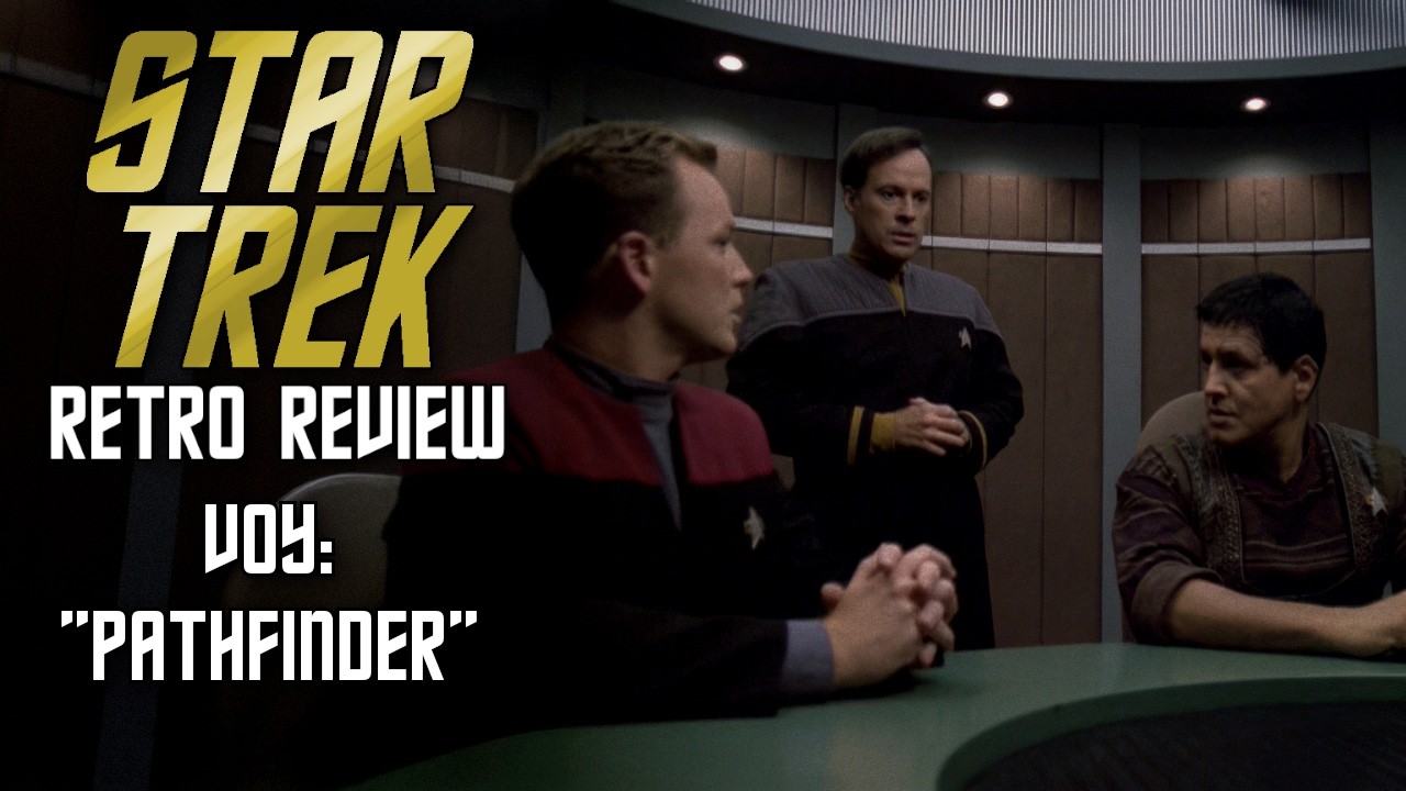 A Star Trek Retro Review of Voyager episode “Pathfinder” titled “Spotlight on Voyager.” The description promotes membership and donations, and shares links to Patreon, PayPal, Venmo, Twitter, Facebook, and Instagram. It also promotes the Late Seating and The Ensign’s Log podcasts with their RSS and SoundCloud pages, plus YouTube URL.