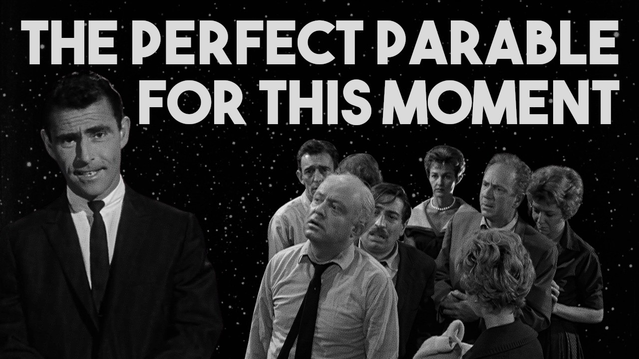 A YouTube video essay argues Twilight Zone’s “The Shelter” is a timely parable about politics and society. The description lists channel perks, donation options, social-media links, and two related podcasts with RSS feeds and SoundCloud pages, plus hashtags and the video’s URL.