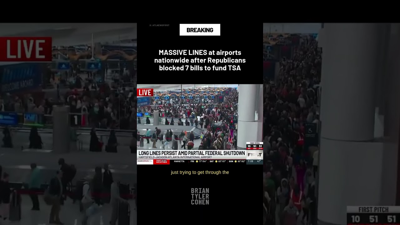 Video reports mass airport lines nationwide tied to Republicans blocking seven funding bills for the TSA. This Shorts clip highlights travel disruption resulting from funding stalemate.