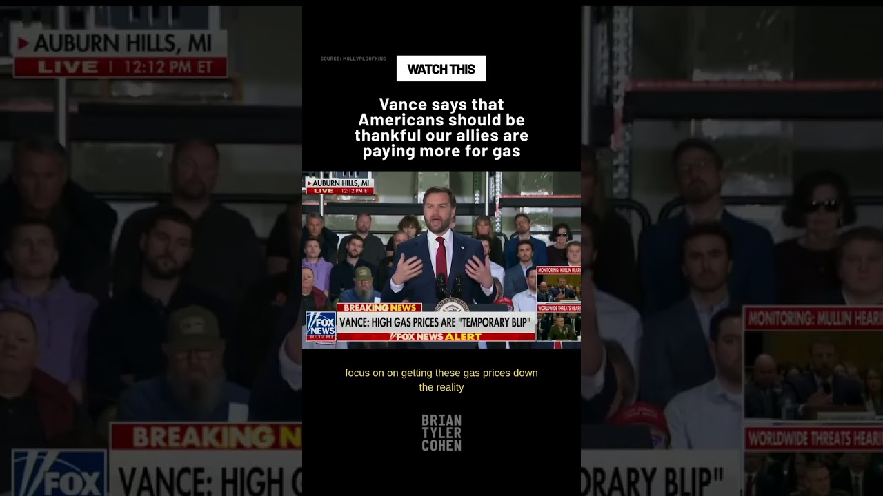 A YouTube Shorts clip quotes Vance arguing Americans should be grateful that U.S. allies are paying higher gas prices.