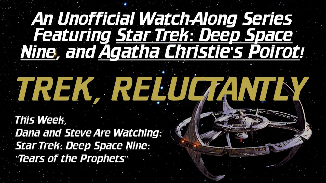 Dana and Steve watch Star Trek: DS9’s “Tears of the Prophets” in a watch-along video, streaming their commentary while viewers must load the episode separately to follow along. The description lists charity links, crowdfunding, social media, related podcasts, and the YouTube video URL.