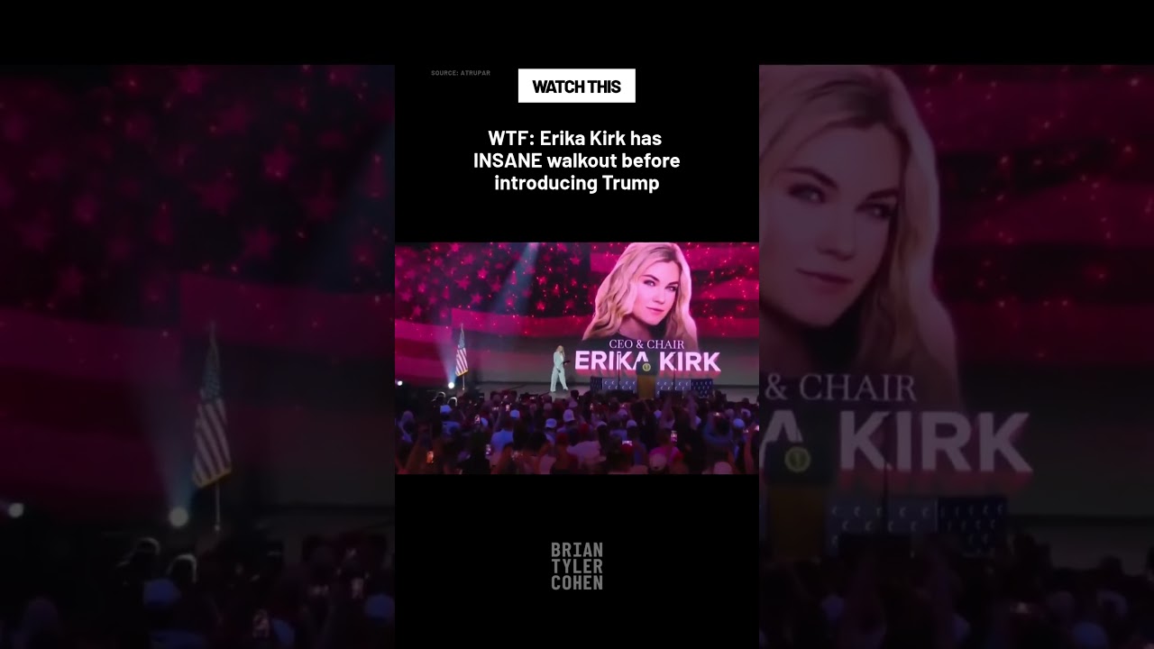 Summary: A YouTube Shorts video titled “WTF: Erika Kirk has INSANE walkout before introducing Trump” shows a dramatic exit before introducing Donald Trump, with a “#shorts” description and a provided URL.
