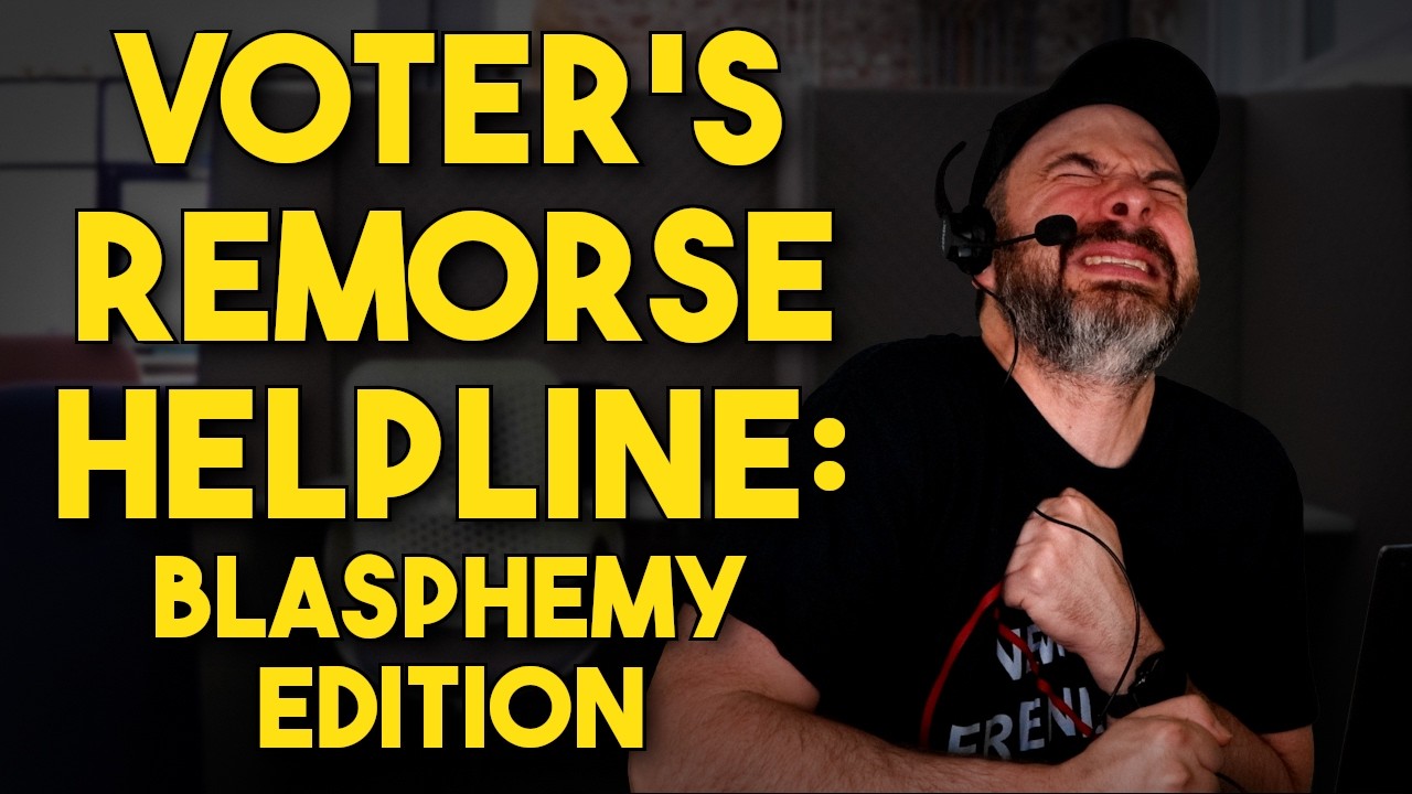 Satirical video titled Voter’s Remorse Helpline: Blasphemy Edition portrays Trump supporters regretting votes after a feud with the Pope and an image of him as Jesus. The post promotes channel membership, donations, and social links, plus links to related podcasts (Late Seating, The Ensign’s Log) and the YouTube video.