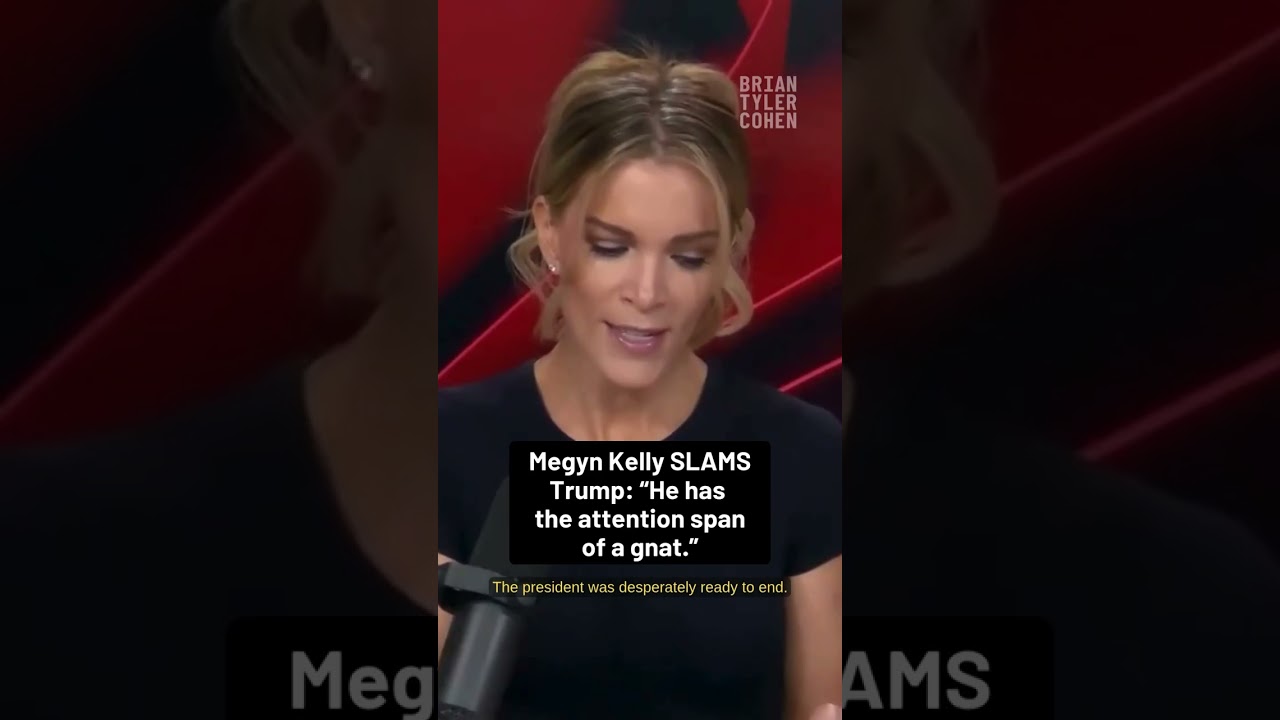 A YouTube Shorts clip features Megyn Kelly criticizing Donald Trump, captioned with the quote “He has the attention span of a gnat.” The post is tagged #shorts and includes the video URL.