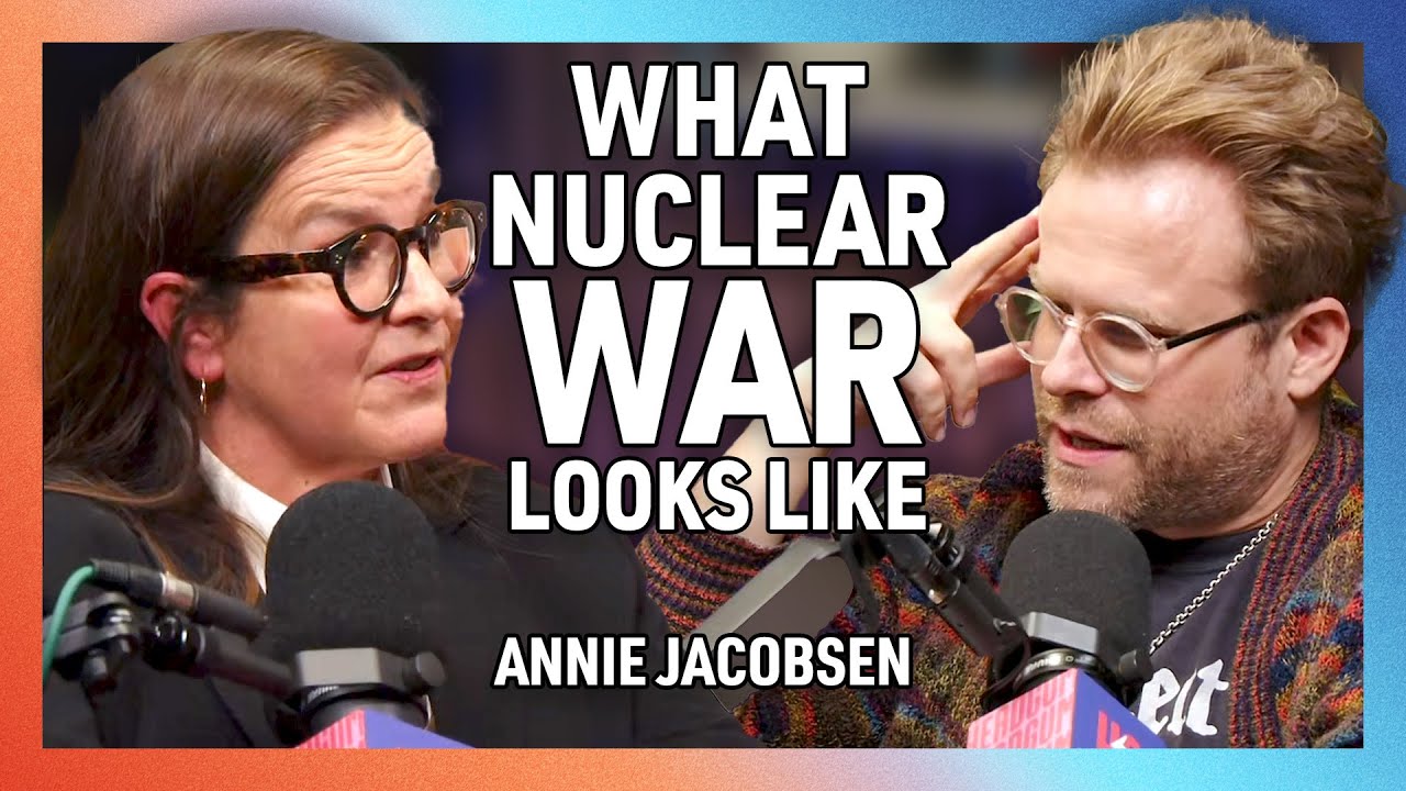 Episode description features Annie Jacobsen discussing her book Nuclear War: A Scenario, which offers a vivid, step-by-step depiction of how nuclear conflict could unfold and threaten civilization. The page also promotes sponsorship, Patreon support, tour dates, Factually! subscriptions on Apple/Spotify, and Headgum social channels, plus YouTube link for the episode.